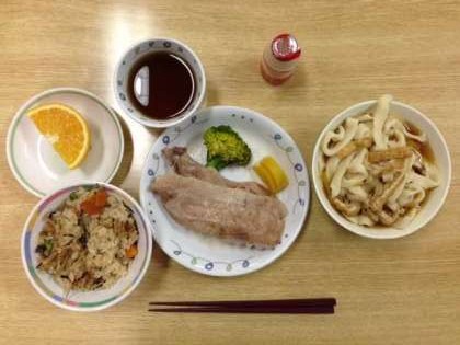 河口湖移動教室最後の夕食のメニューは、たきこみごはん、うどん汁、豚ロースのソテー、茹で野菜、漬物、オレンジ、ヤクルトです。