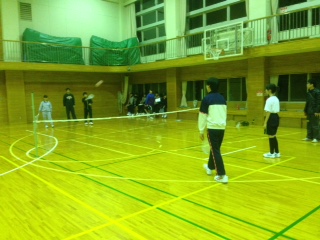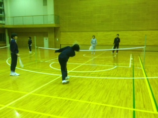 夕食を済ませ、レクリエーションの時間。今日は、明日の合同レクリエーションでやるミニテニスの練習をしました。