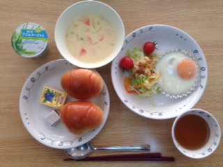 今朝のメニューは、パン、サラダ、ベーコンエッグ、コーンスープです。