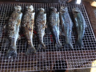 猪之頭養鱒場では、マスを釣って調理し、お弁当と一緒にいただきます。