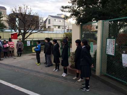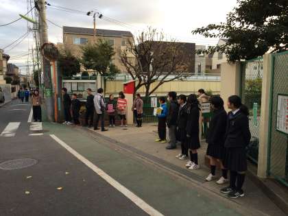 9日、10日の若林小学校に続き、本日12日は「世田谷杜の学び舎」の城山小学校正門にて児童会と生徒会の役員会合同のユニセフ募金活動を行いました。