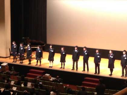 「人間関係をよりよくするために」をテーマに生徒会活動で実践したことがらを発表し、後輩の1年生に向けて有意義な中学校生活を送るためのメッセージを送りました。
