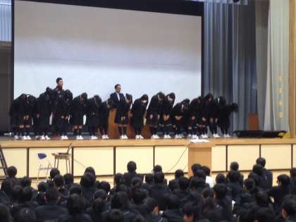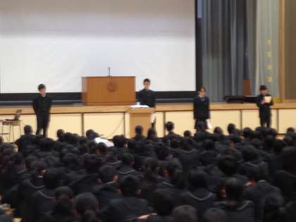 19日に月に1度の生徒会朝礼が行われました。生徒会からの連絡、各委員会からの取組内容の報告の後、先日都大会に出演した演劇部の表彰がありました。都大会後の協議会で、来年度の全国大会への出演が決まったことが校長先生より報告されました。