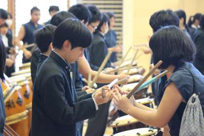 約160名の生徒が和太鼓の体験をしました。初めて和太鼓に触れる生徒も多かったですが、和太鼓部の皆さんが丁寧に指導してくださいました。とても貴重な体験になりました。