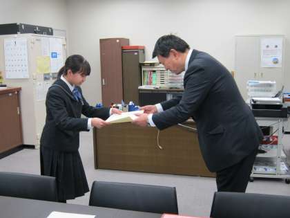 28日、「社会を明るくする運動」作文コンクールに応募し、優秀と認められた1年生の女子生徒が、来校した担当の方から校長室で表彰状を授与されました。