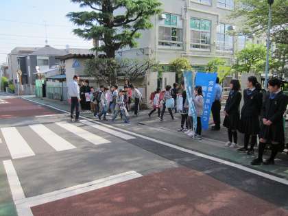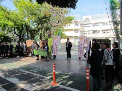世田谷中の有志の生徒が各小学校に出向き、小学生と一緒にあいさつ運動を行いました。明日も行います。地域・保護者の皆様のご参加もお待ちしています。