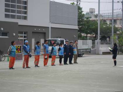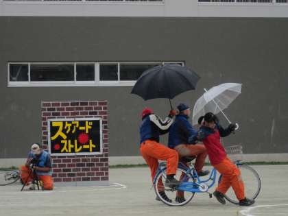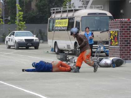 5月9日(土)3校時に校庭で交通安全教室が開かれました。北沢警察署とスタントマンの方が来校し、自転車の正しい乗り方とよくある自転車事故の再現をしてくれました。
