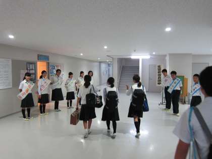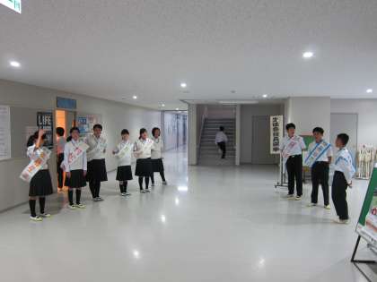 18日に行われる「生徒会役員選挙」に向けて、立候補の届け出をすませた候補者の選挙活動が8日朝から始まりました。