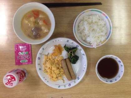 好天に恵まれて連合移動教室2日目がスタートしました。朝会の後、朝食を食べました。メニューはごはん、ふりかけ、いり卵、ほうれん草のおひたし、ボイルウインナー、つけもの、ジョアでした。