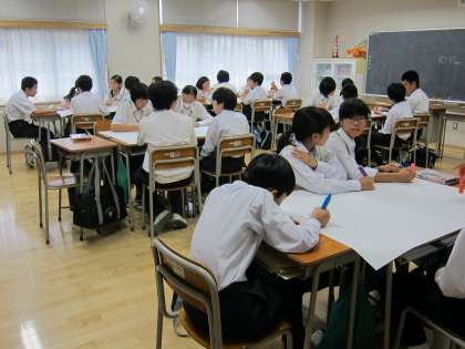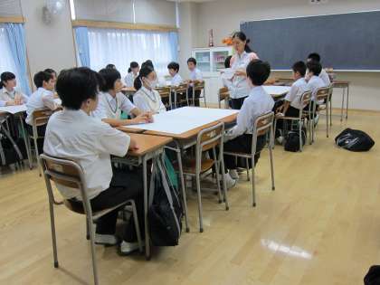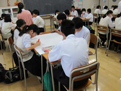本日、1年生で各学級ごとに取り組んでいる「いじめ防止ワークショップ」第3回を行いました。今日は、自分の大好きなところ、大切にしてきたこと、身につけてきたこと、自慢すること、長い間頑張ってきたことなどを各自が模造紙に書き込みました。