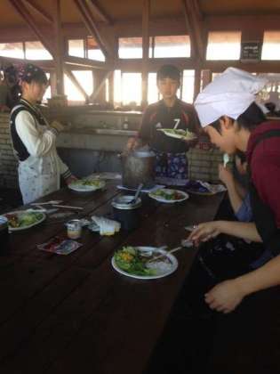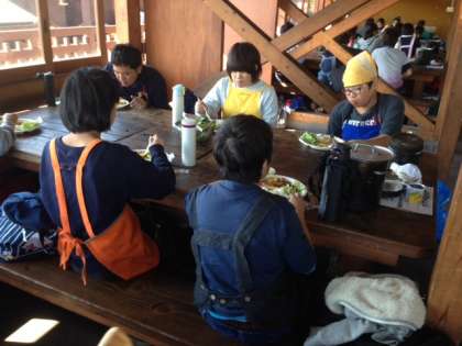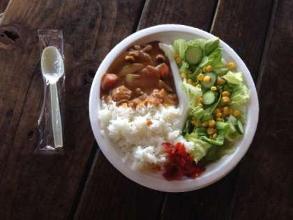 班で協力して出来上がった、カレーとサラダで昼食です。いただきます。