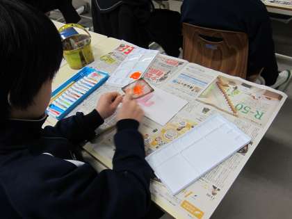 1年生の美術の授業で「モダンテクニック」という単元の一つである「スパッタリング」という表現技法に取り組みました。偶然にできた色彩や形の美しさの魅力を知るための取組です。熱心に創作に励みました。