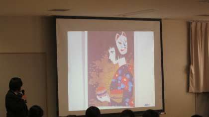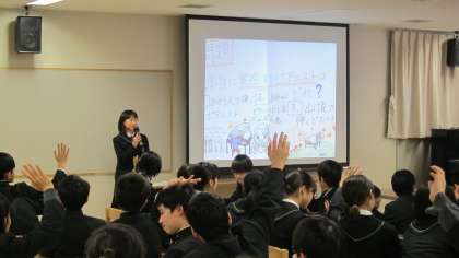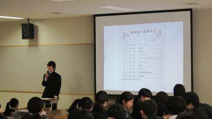 3日5校時、1年生では「職業調べ」の学年発表会を行いました。これは、冬休み中の課題として出された「職業調べ」の優秀作品を各クラスで2点ずつ選び、その選ばれた人たちが学年全体の前で映像を交えて発表するという取組でした。