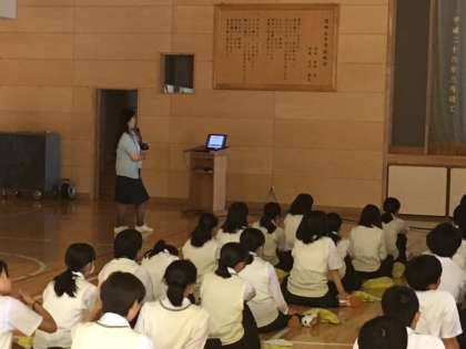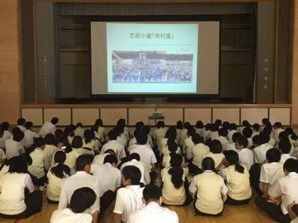 7月5日(火)に国立劇場で歌舞伎鑑賞教室が行われます。その事前学習が体育館でありました。音楽科の天田先生を講師にお迎えして、歌舞伎についてわかりやすく説明していただきました。クイズ形式を交えながら子どもたちは興味深く聞き入っていました。