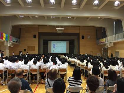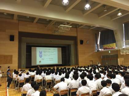本日(7月6日)6時間目は、全校生徒が体育館に集まり、セーフティ教室を開催しました。KDDIより講師をお招きし、スマホとケータイの安全な使い方についてお話していただきました。