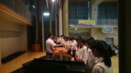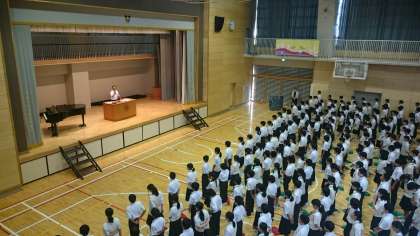 夏休みも終わり、本日から二学期が始まりました。始業式では、校長先生のお話、校歌斉唱、夏休み中に行われた部活動の表彰などが行われました。二学期は、校外学習や宿泊行事、学芸発表会など行事がたくさんある学期になります。勉強に行事に、一学期以上に充実した学校生活にしていきましょう。