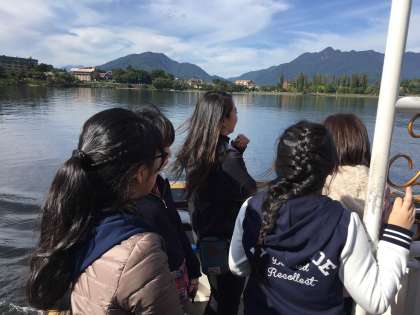 最終日の今日は晴天!きれいな富士山が見えました。来た時よりきれいにすべく部屋の掃除をし、閉園式をしました。その後、河口湖を遊覧船に乗って一巡り。穏やかな風ときれいな景色に生徒たちは見とれていました。