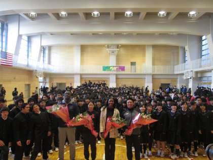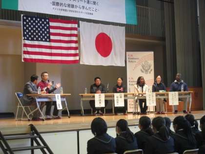 1月31日、アメリカ大使館の協力のもと、元メジャーリーガーの岩村明憲氏、女子ソフトボールのアメリカ代表のNatasha Watley内野手、日本代表の山根佐由里投手、アメリカンフットボールのKevin Jackson選手をお招きし、本校を会場としてアメリカ合衆国とのスポーツ交流事業が実施されました。とても貴重な体験となりました。