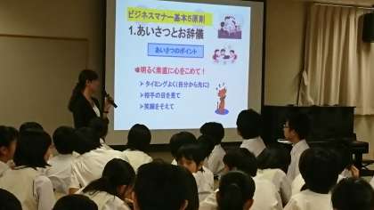 本日、2学年では職場体験に向けて、礼儀やマナーを学ぶ「マナー講座」を開催しました。キャリアコンサルタントの中野眞理子さんを講師に迎え、事前打ち合わせでの第一印象の大切さから本番の心構えまで丁寧に教わりました。また、お辞儀の仕方や言葉づかいの練習など実習的な内容もあり、充実した講習になりました。