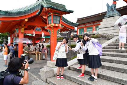 こちらは雨がポツポツ降り出しました。伏見稲荷大社にも班別行動でやってきました。