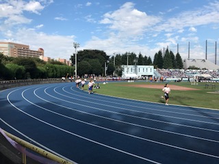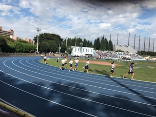 本日は、世田谷区総合運動場 陸上競技場にて、世田谷区立中学校陸上競技大会が行われています。朝は少し雨も降っていましたが、午後からは日差しもさし、良い天気の中午後の競技が行われています。写真は、女子800mの様子です。