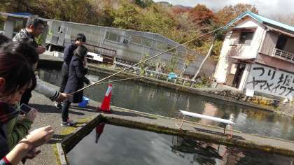 猪之頭養鱒場でマス釣りと餌やりを体験しました。希望者は自分で釣った魚をさばきました。