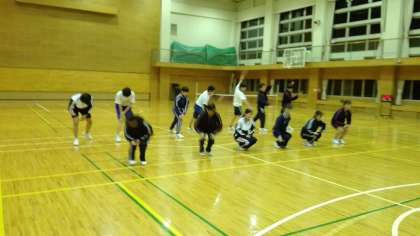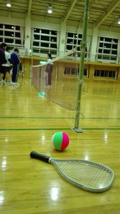 食後のレクは、体育館で班対抗ミニテニス大会。準備運動は学芸発表会で踊った校歌ダンスです。