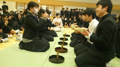 茶道の心得を示す『和敬静寂』とは、「主人と客が互いの心を和らげてつつしみ敬い、茶室の品々や雰囲気を清浄な状態に保つこと」だと教えていただきました。各クラスから2名の生徒が茶道体験をしました。