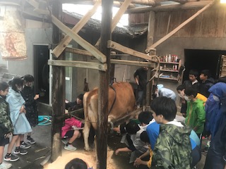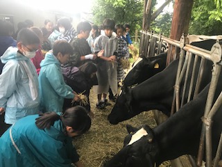 午後は酪農体験です。乳搾りや餌やり、バター作りなどを体験しました。