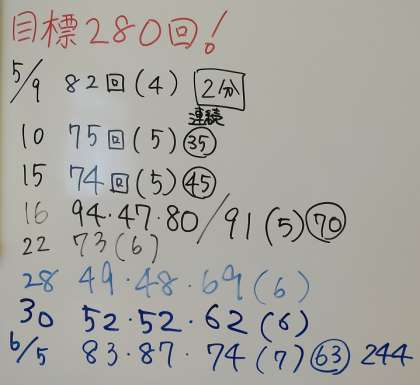 大縄跳び、去年の記録は264回。今年の目標は280回!今までの記録は写真の通りです。さあ、本番は???とドキドキ。