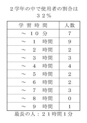 参考に、3月2日〜16日までの間に、2年生の中でどのくらいの人がどのくらいの時間利用しているか、お知らせします。