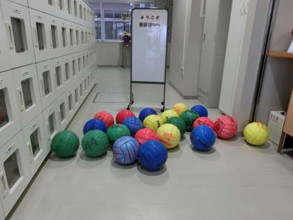 今日の写真は昼休みの貸出用ボールの整備の様子です。パンクしてしまい使えなくなったものを廃棄して少しだけボールを補充しました。今年度から「自分の学年カラーのボールを借りて使う」形にしてみようと思っています。