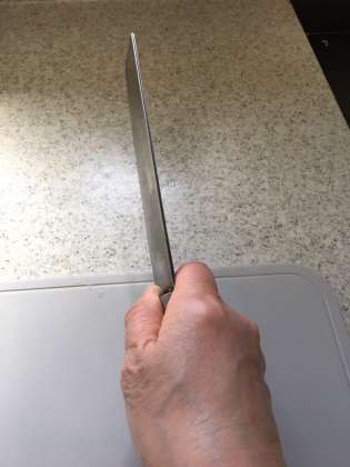 包丁の持ち方はこんな感じ。しっかりグーで握ります。