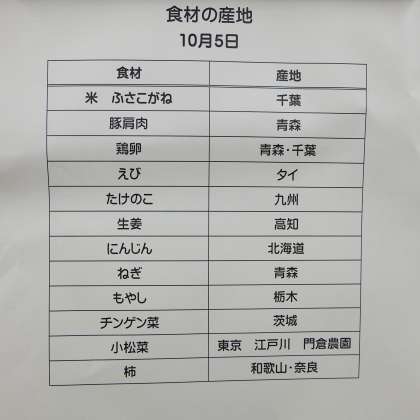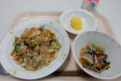 《今日の献立》 ・えびあんかけチャーハン ・小松菜サラダ ・柿 ・牛乳