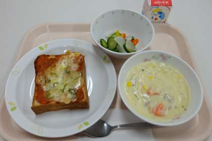 《今日の献立》 ・ツナピザトースト ・ピクルス ・コーンクリームスープ ・牛乳