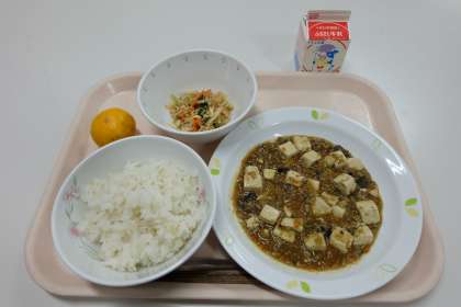 《今日の献立》 ・麦ごはん ・麻婆豆腐 ・切り干し大根ナムル ・温州みかん ・牛乳