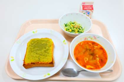 12月15日(火)の給食 公開日 2020/12/15 更新日 2020/12/15 給食 《今日の献立》 ・スイートポテトトースト ・冬野菜のミネストローネ ・水菜とツナのサラダ ・牛乳 いいね(0) 給食
