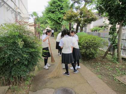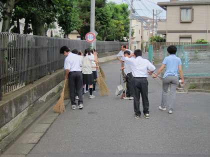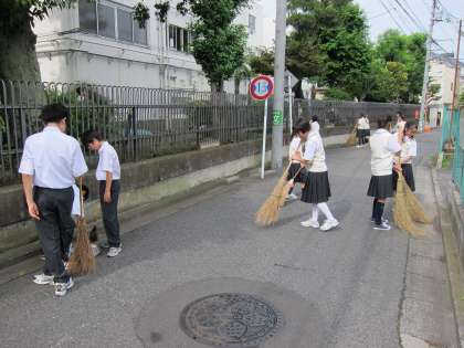 雨上がりの道路で、路面がぬれていましたが、学校周辺をきれいにしようと、一生懸命掃除をしました。