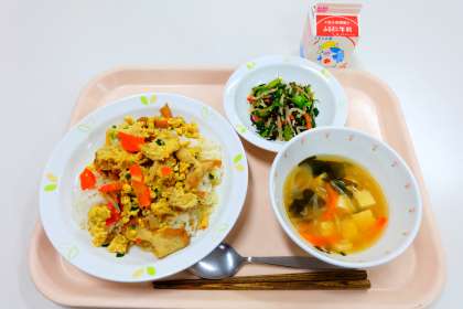 《今日の献立》 ・油麩丼(あぶらふどん) ・ひじき入り中華サラダ ・大根のみそ汁 ・牛乳