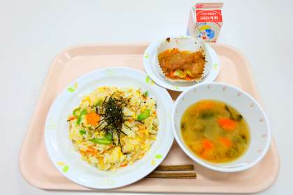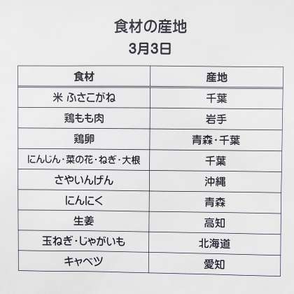 《今日の献立》 ・五目ずし ・鶏肉と野菜の香味焼き ・菜の花のみそ汁 ・牛乳