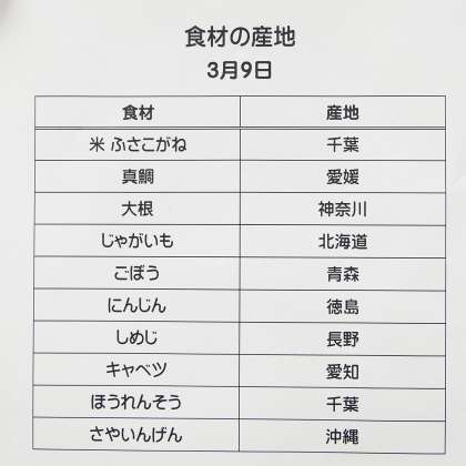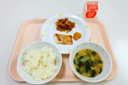 3月9日(火)の給食 公開日 2021/03/09 更新日 2021/03/09 給食 《今日の献立》 ・ごはん ・真鯛の塩焼き 大根おろし ・揚げじゃがのきんぴら ・キャベツと油揚げのみそ汁 ・牛乳 いいね(0) 給食