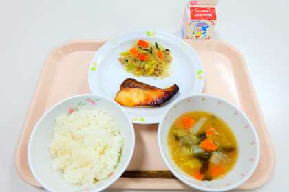 《今日の献立》 ・ごはん ・ぶりの西京焼き ・炒合菜 ・白菜のみそ汁 ・牛乳