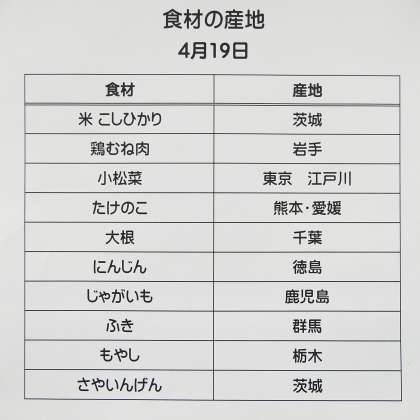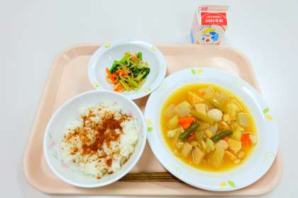 4月19日(月)の給食 公開日 2021/04/19 更新日 2021/04/19 給食 《今日の献立》 ・ごはん ・おかかふりかけ ・ふきと春野菜の煮物 ・小松菜のごまあえ ・牛乳 いいね(0) 給食