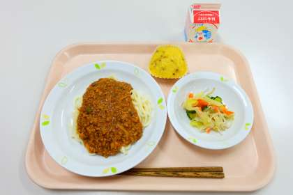 《今日の献立》 ・肉味噌うどん ・野菜の甘酢あえ ・さつまいも入り蒸しパン ・牛乳