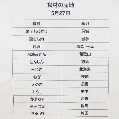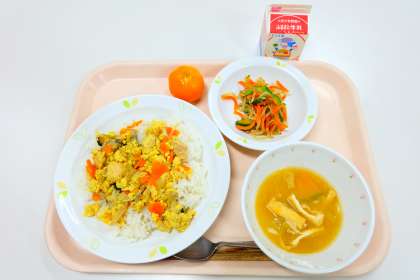 《今日の献立》 ・親子丼 ・ナムル ・かぼちゃのみそ汁 ・冷凍みかん ・牛乳