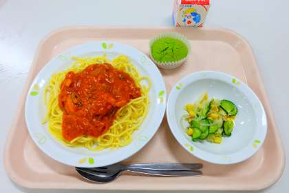 《今日の献立》 ・魚介のトマトクリームパスタ ・コーンサラダ ・小松菜マフィン ・牛乳