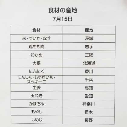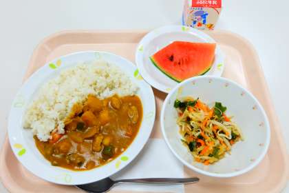 《今日の献立》 ・夏野菜のチキンカレーライス ・大根とわかめのサラダ ・小玉すいか ・牛乳