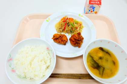 《今日の献立》 ・ごはん ・油淋鶏 ・春雨の五目炒め ・豆腐のみそ汁 ・牛乳