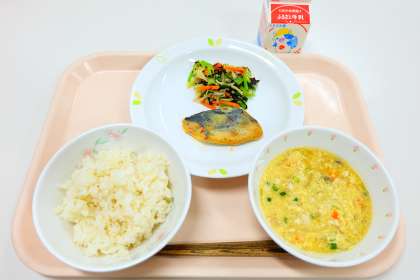 《今日の献立》 ・ごはん ・さわらの西京焼き ・野菜ののりあえ ・かみなり汁 ・牛乳