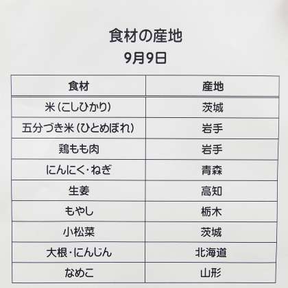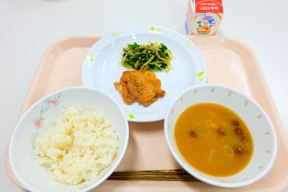 9月9日(木)の給食 公開日 2021/09/09 更新日 2021/09/09 給食 《今日の献立》 ・ごはん ・鶏肉のしょうが焼き ・菊花おひたし ・油揚げとなめこのみそ汁 ・牛乳 いいね(0) 給食